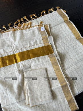 Onam Special Ivory Golden Square check Cotton Kerala saree