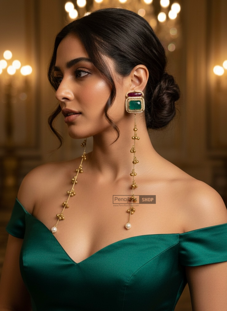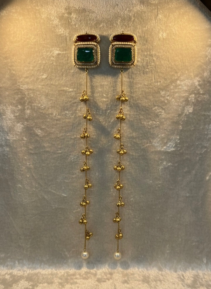 92.5 coated Fusion Long Ghungroo Ruby Green Kashmiri earrings