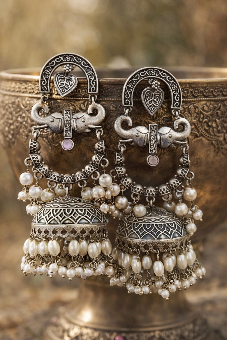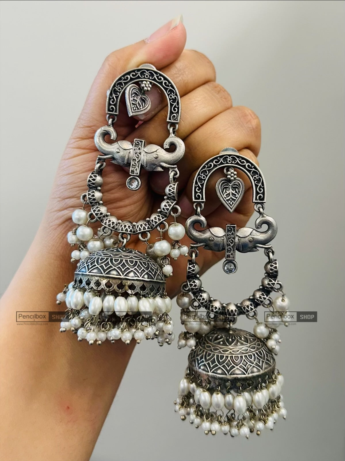 German silver lookalike Elephant Long Pearl Jhumka earrings.