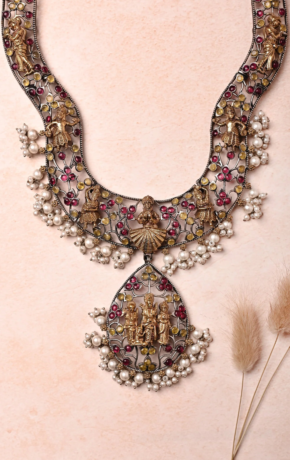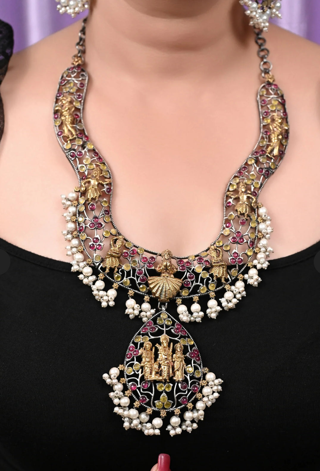 German Silver Ram Parivar ruby Big Statement Necklace set.