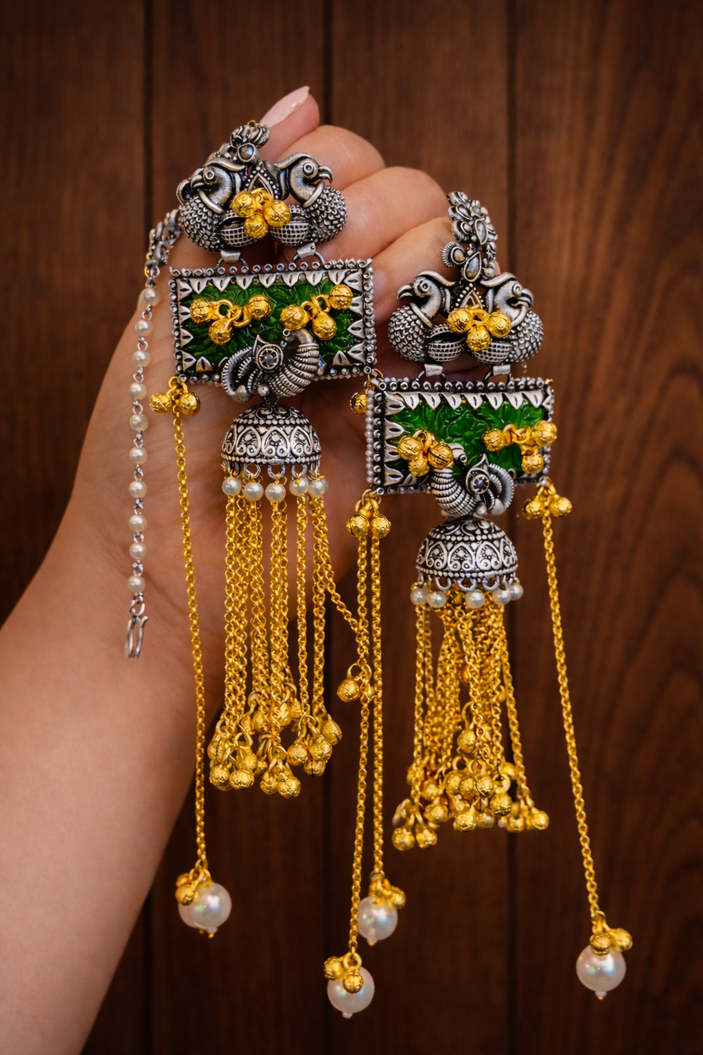 Ghungroo 92.5 coated Long Pearl Fusion Green Carved Ear chain Kashmiri earrings.