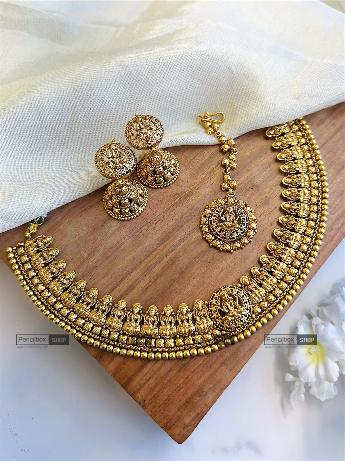 Lakshmi ji Golden Solid golden Necklace set with maangtikka.