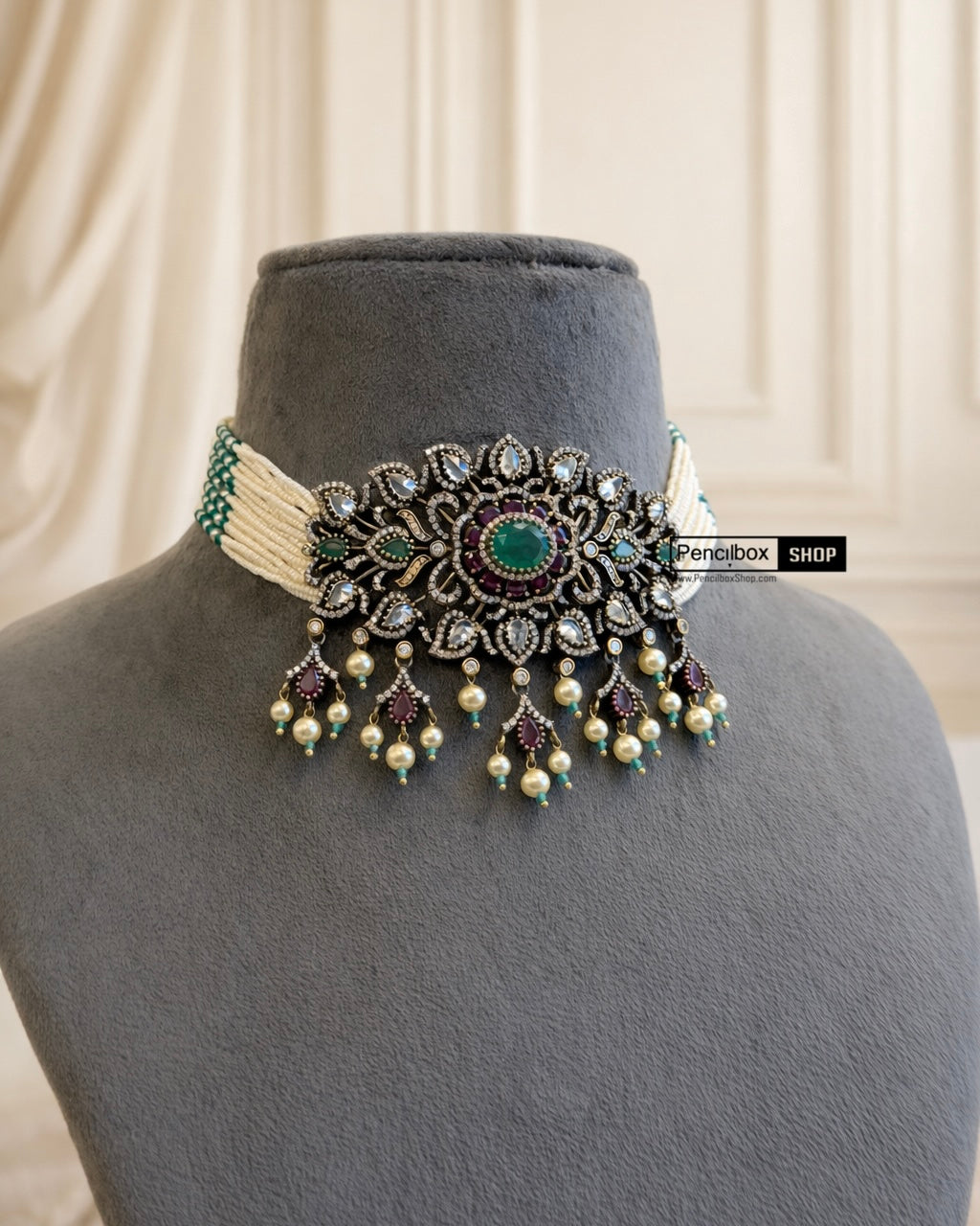 Ruby Green Silver Celebrity American Diamond Choker necklace set.